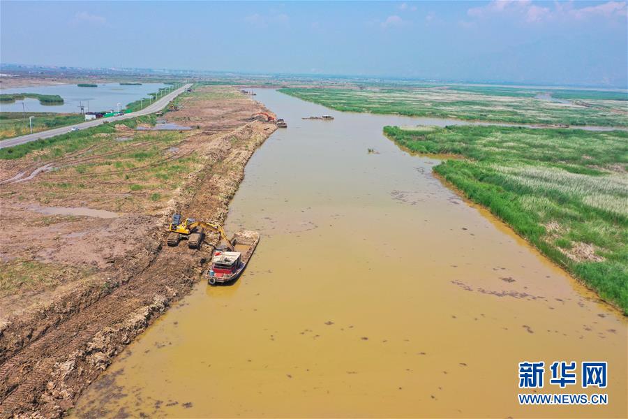 7月15日,挖掘机在呼和浩特市土默特左旗境内的哈素海湿地清除淤泥(无人机照片)。 近年来,内蒙古呼和浩特市土默特左旗着力推进哈素海湿地修复治理工程,通过清淤和清除过多芦苇,疏通进出水口通道和水体交换通道,使哈素海湿地各项功能得到明显恢复和提升。 新华社记者 徐钦 摄