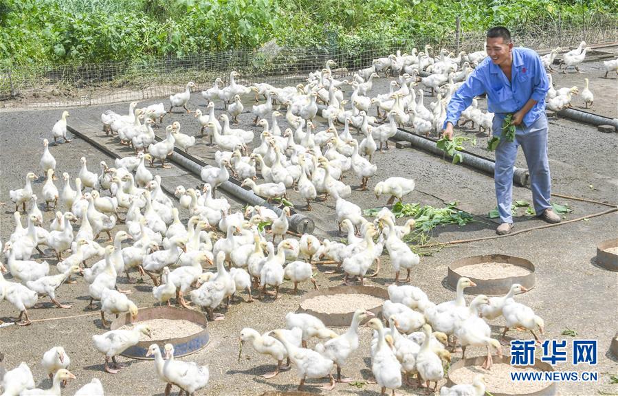 7月16日,在河北省深州市前磨头镇西石村,朱少杰在喂鹅。 朱少杰是河北省深州市前磨头镇西石村村民,前些年因患病花光了积蓄,日子过得拮据。2017年,朱少杰被确定为建档立卡贫困户。在乡村党员帮助下,苏少杰认真学习养殖技术,发展养鹅产业,依靠勤劳双手成功摘掉贫困户的“帽子”。如今,苏少杰已成为当地养殖能手,带领周围乡亲增收奔小康,实现由贫困户到致富能手的华丽转身。 新华社记者 李晓果 摄
