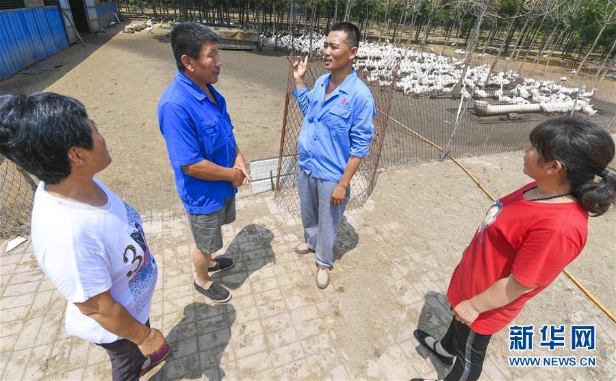 7月16日,在河北省深州市前磨头镇西石村,朱少杰(右二)为村民讲解养鹅技术要领。 朱少杰是河北省深州市前磨头镇西石村村民,前些年因患病花光了积蓄,日子过得拮据。2017年,朱少杰被确定为建档立卡贫困户。在乡村党员帮助下,苏少杰认真学习养殖技术,发展养鹅产业,依靠勤劳双手成功摘掉贫困户的“帽子”。如今,苏少杰已成为当地养殖能手,带领周围乡亲增收奔小康,实现由贫困户到致富能手的华丽转身。 新华社记者 李晓果 摄