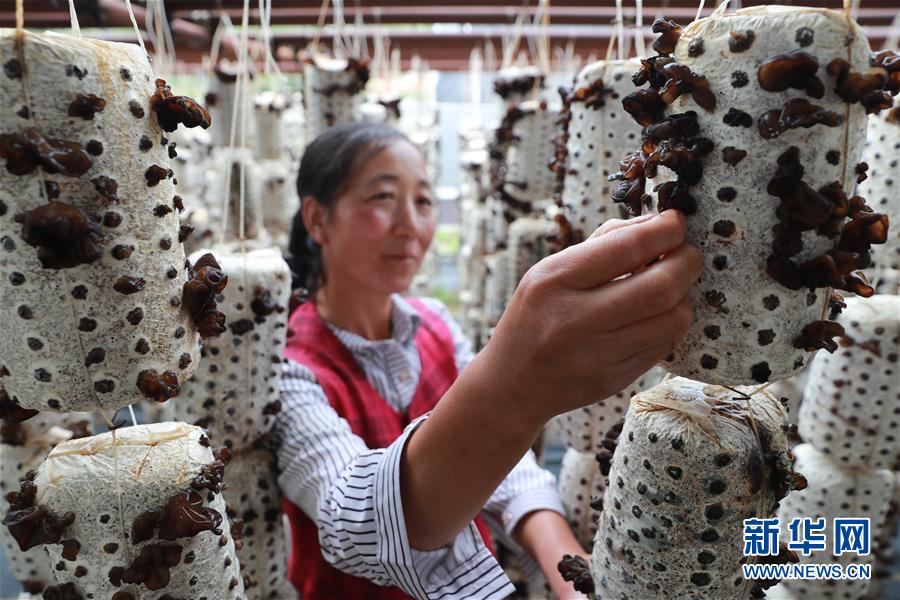 7月16日,在舟曲县曲瓦乡城马村,村民在摘木耳。 近年来,甘肃省甘南藏族自治州舟曲县在脱贫攻坚中,结合当地资源优势与环境特点,大力发展特色农产品种植和林下养殖,促进当地农民增收致富。 新华社发(杜哲宇 摄)
