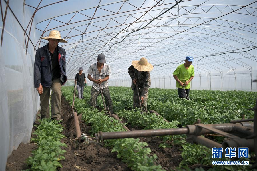 7月16日,在春城马铃薯专业合作社马铃薯种薯种植基地,工人在马铃薯种薯网棚中进行耕作。 近年来,黑龙江省依安县大力发展马铃薯种薯产业,带动农民脱贫增收。全县通过春城马铃薯专业合作社等大型马铃薯合作社托管方式,为每户建档立卡户代种1亩马铃薯种薯。2019年全县发展“一亩种薯”1.2万亩,实现建档立卡户全覆盖。 新华社记者王建威摄