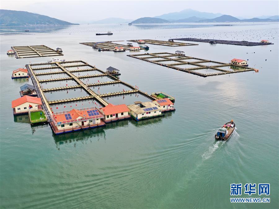 7月15日,渔船驶过福建省宁德市三都澳大黄鱼深水塑胶渔排养殖区(无人机照片)。新华社记者姜克红摄