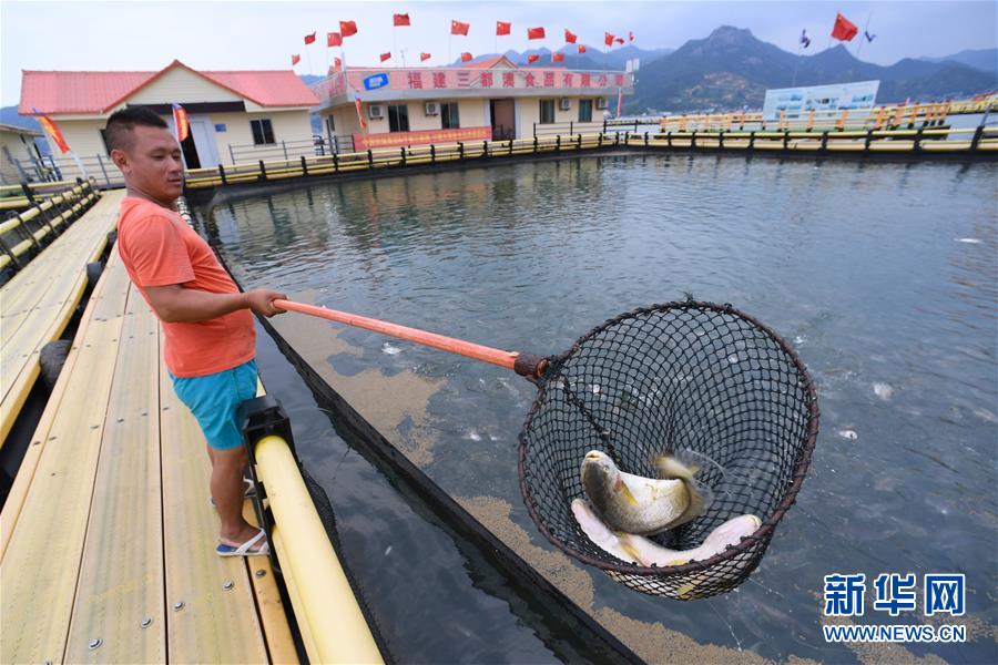 7月15日,在福建省宁德市三都澳大黄鱼深水塑胶渔排养殖区,福建三都澳食品有限公司工作人员捞起大黄鱼查看长势。新华社记者姜克红摄
