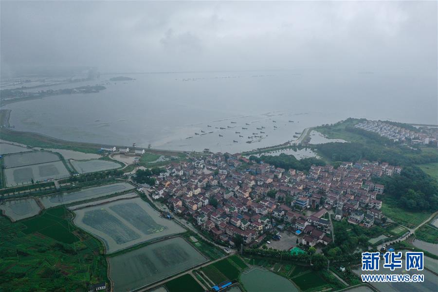 7月16日拍摄的南京境内的石臼湖(无人机照片)。 受降雨以及水阳江上游来水等因素影响,江苏省南京市高淳区、溧水区境内的石臼湖水位持续上涨。7月16日16时45分,石臼湖蛇山站水位达12.60米,超警戒水位2.20米,超保证水位0.10米,且预测水位将继续上涨。 新华社记者 季春鹏 摄