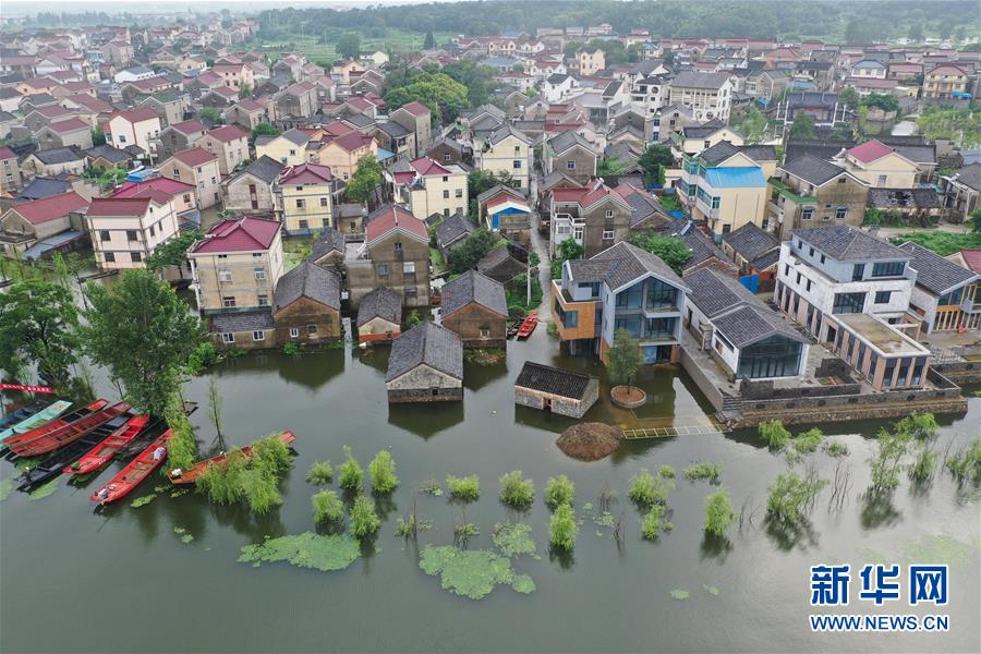 7月16日拍摄的南京市溧水区和凤镇张家社区(无人机照片)。和凤镇张家社区部分房屋因石臼湖涨水被淹。 受降雨以及水阳江上游来水等因素影响,江苏省南京市高淳区、溧水区境内的石臼湖水位持续上涨。7月16日16时45分,石臼湖蛇山站水位达12.60米,超警戒水位2.20米,超保证水位0.10米,且预测水位将继续上涨。 新华社记者 季春鹏 摄