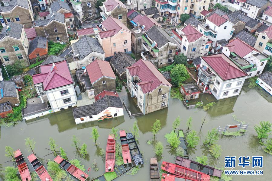 7月16日拍摄的南京市溧水区和凤镇张家社区(无人机照片)。和凤镇张家社区部分房屋因石臼湖涨水被淹。 受降雨以及水阳江上游来水等因素影响,江苏省南京市高淳区、溧水区境内的石臼湖水位持续上涨。7月16日16时45分,石臼湖蛇山站水位达12.60米,超警戒水位2.20米,超保证水位0.10米,且预测水位将继续上涨。 新华社记者 季春鹏 摄