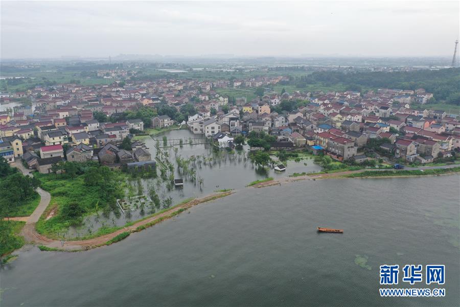 7月16日拍摄的南京市溧水区和凤镇张家社区(无人机照片)。和凤镇张家社区部分房屋因石臼湖涨水被淹。 受降雨以及水阳江上游来水等因素影响,江苏省南京市高淳区、溧水区境内的石臼湖水位持续上涨。7月16日16时45分,石臼湖蛇山站水位达12.60米,超警戒水位2.20米,超保证水位0.10米,且预测水位将继续上涨。 新华社记者 季春鹏 摄