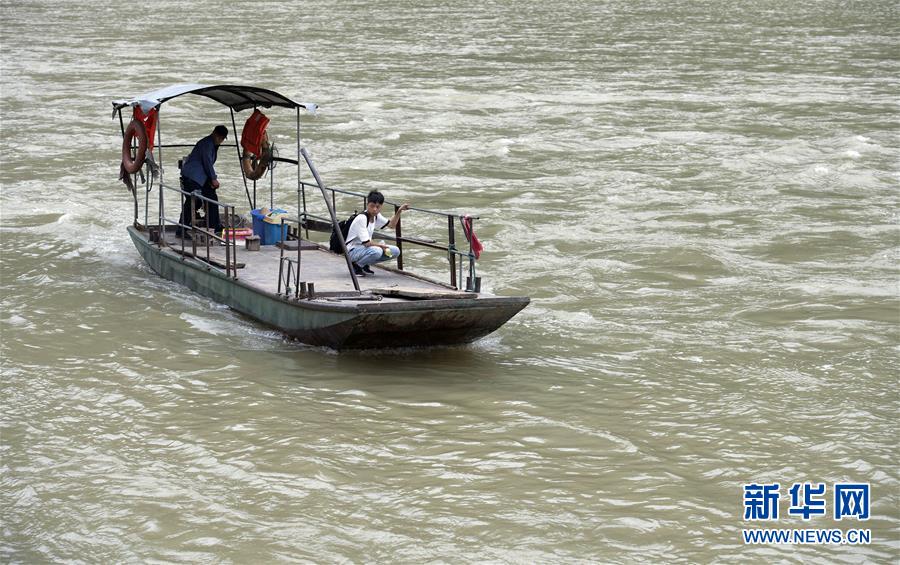 7月16日,韩文新(左)载着客人驾船过江。即使只有一名客人,韩文新也不计成本为乡亲们服务。 新华社记者 陶明 摄