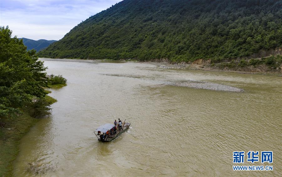 7月16日,韩文新在庙上渡口驾船帮乡亲们渡江(无人机照片)。 新华社记者 陶明 摄