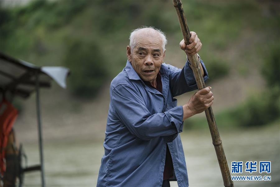 7月16日,韩文新驾船帮乡亲们渡江。 新华社记者 陶明 摄