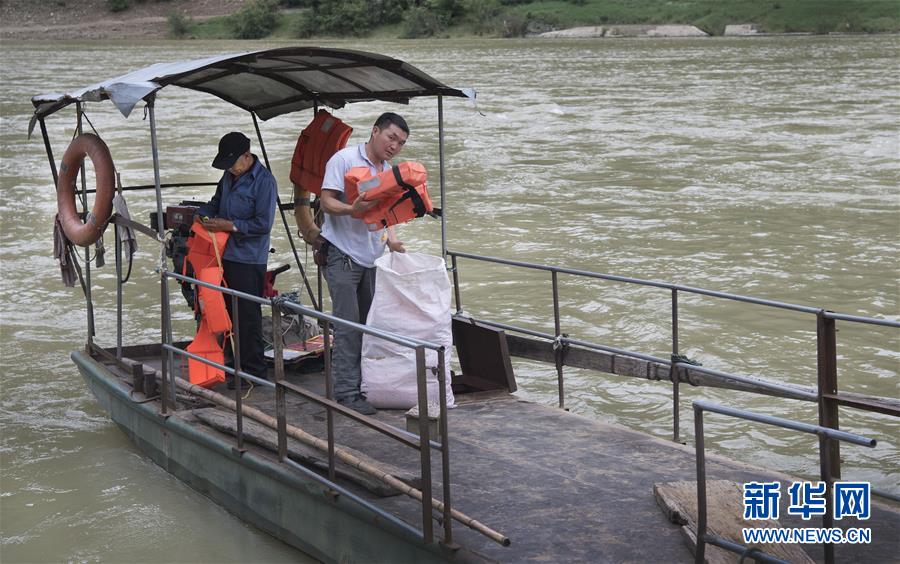7月16日,韩文新(左)、韩宝成父子在检查船上海事部门配备的救生装备。 新华社记者 陶明 摄