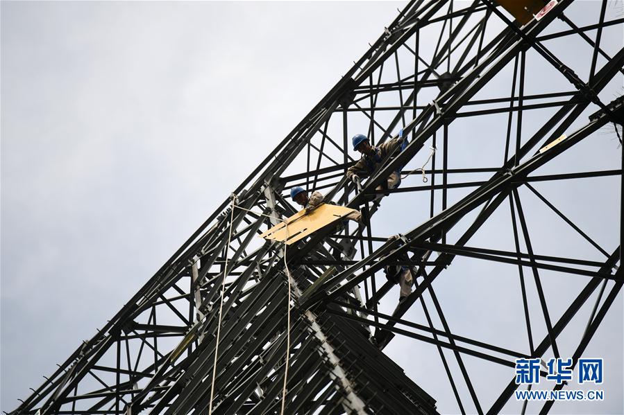 在天津市武清区豆张庄镇,电力工人在输电铁塔上安装防鸟挡板(7月16日摄)。新华社发(赵子硕 摄)