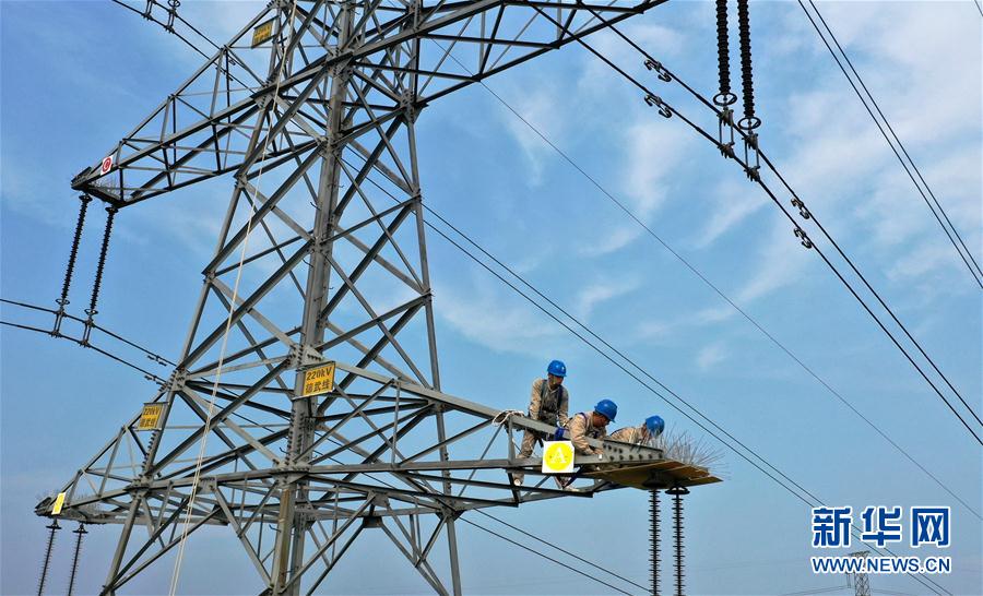 在天津市武清区豆张庄镇,电力工人在输电铁塔上安装防鸟挡板(7月16日摄,无人机照片)。 新华社记者 李然 摄