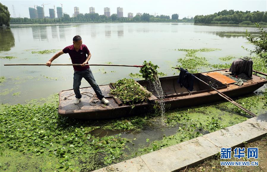 江苏省宿迁市,黄宝军在京杭大运河上清理河中的杂草(7月15日摄)。 新华社记者 李雨泽 摄