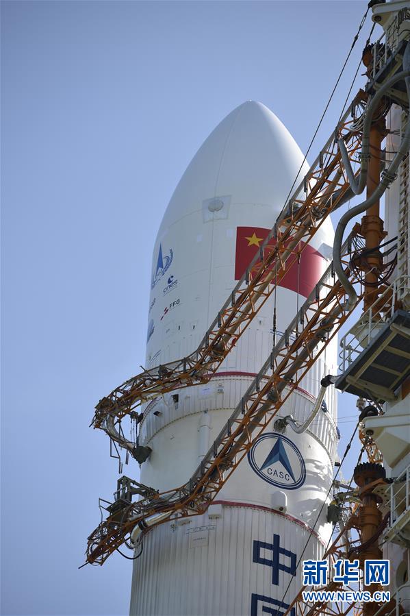7月17日在中国文昌航天发射场拍摄的长征五号遥四运载火箭。 当日,长征五号遥四运载火箭在中国文昌航天发射场完成技术区总装测试工作后,垂直转运至发射区,计划于7月下旬到8月上旬择机实施我国首次火星探测任务(行星探测工程天问一号任务)。 新华社发(张高翔 摄)