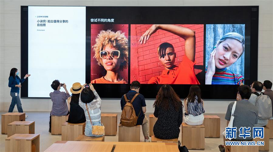 7月16日,在北京苹果三里屯零售店举行的媒体预览活动中,媒体记者在参加店内的摄影学习课程。 7月17日,苹果三里屯零售店在北京全新亮相。该店是苹果在亚太地区第一家采用集成太阳能电池组的零售店,可以为门店提供电力。店内还提供了供企业家、开发者和其他中小企业客户的商谈室。为做好疫情防控,消费者进店前需要佩戴口罩和测量体温,并在店内保持社交距离,店内也提供消毒洗手液。 新华社记者 才扬 摄