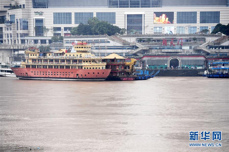 7月17日,长江重庆朝天门段水位明显上涨,一艘客轮停靠在朝天门码头。 受强降雨影响,近日长江上游干流及三峡区间来水明显增加,三峡水库入库流量快速上涨,7月17日10时达到50000立方米/秒。根据全国主要江河洪水编号规定,此次来水达到洪水编号标准,“长江2020年第2号洪水”在长江上游形成。预计17日20时三峡水库最大入库流量在55000立方米/秒左右。 新华社记者 唐奕 摄