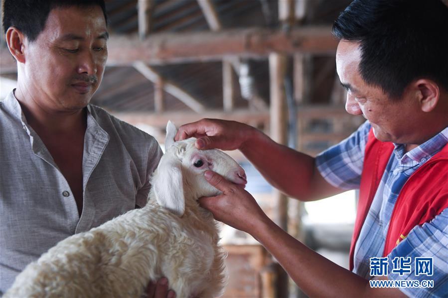 7月17日,清凉峰镇农技部门的党员志愿者(右)在颊口村一家养羊的家庭农场进行定期走访。 近年来,浙江省杭州市临安区清凉峰镇积极推进和扶持家庭农场的发展,组织农技部门的党员志愿者对农场进行点对点帮扶、定期走访,把技术和服务送到农户家中,助力当地乡村现代农业的发展。 新华社记者 徐昱 摄