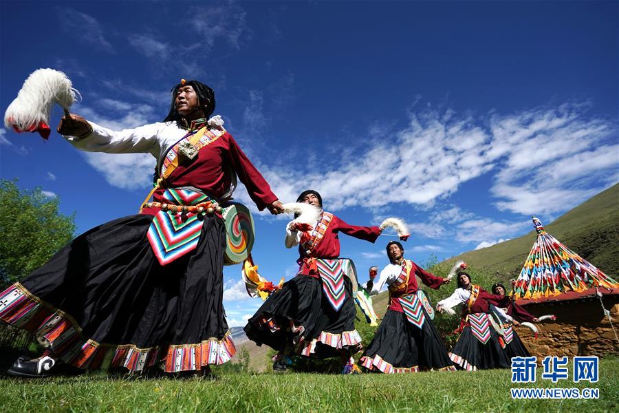 尼玛老人的弟子们正在表演“久河卓舞”(7月1日摄)。新华社记者 詹彦 摄