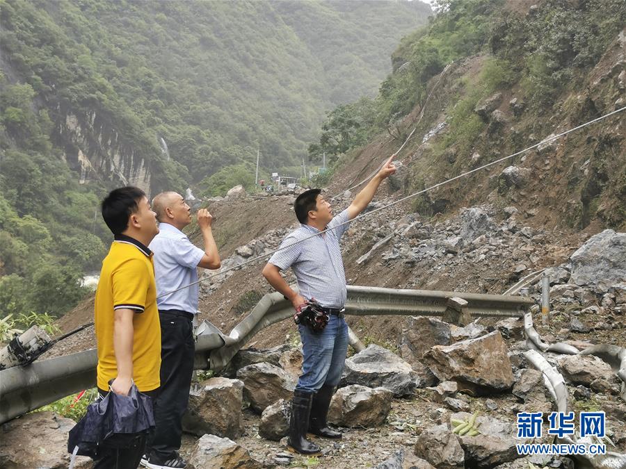 7月17日,在重庆市巫溪县兰英乡,当地政府工作人员在查看山体滑坡损毁道路情况。 记者从重庆市防汛抗旱指挥部了解到,重庆市自15日起迎来新一轮强降雨天气过程,目前已致18万余人受灾,当地已启动防汛救灾气象保障服务Ⅱ级应急响应。 新华社发
