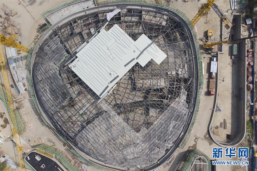 7月17日,在哈尔滨极地公园施工现场,工人在进行屋顶玻璃安装(无人机照片)。 目前,黑龙江哈尔滨极地馆二期项目——哈尔滨极地公园建设有序进行。哈尔滨极地公园将新建“鲸世界”“极地奇幻秀场”“北极熊馆”“南极企鹅岛”等主题景区。 新华社发(张涛 摄)