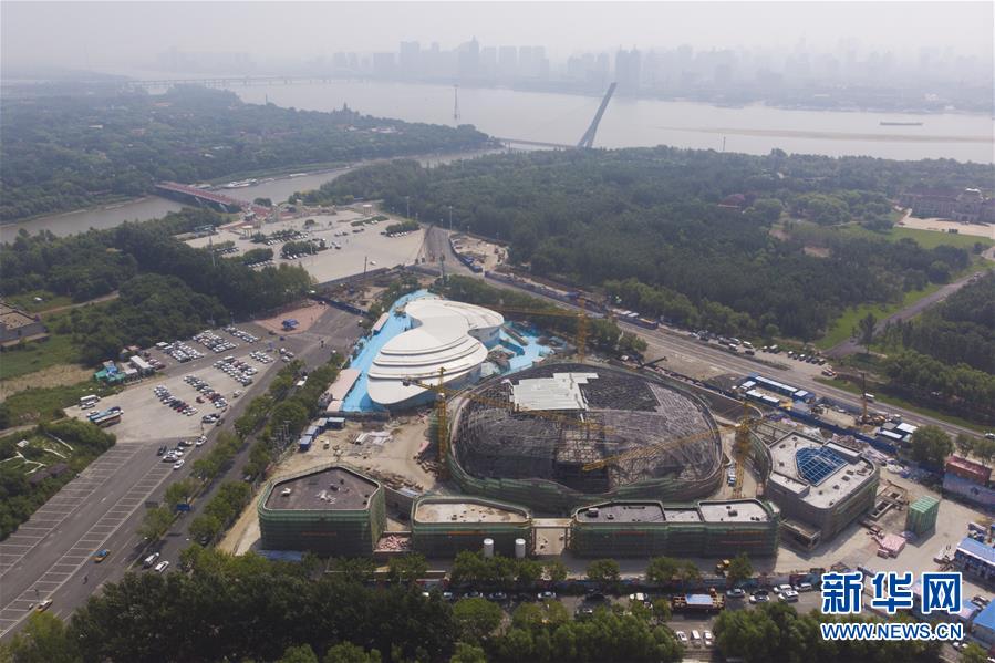 这是7月17日拍摄的哈尔滨极地公园施工现场(无人机照片)。 目前,黑龙江哈尔滨极地馆二期项目——哈尔滨极地公园建设有序进行。哈尔滨极地公园将新建“鲸世界”“极地奇幻秀场”“北极熊馆”“南极企鹅岛”等主题景区。 新华社发(张涛 摄)