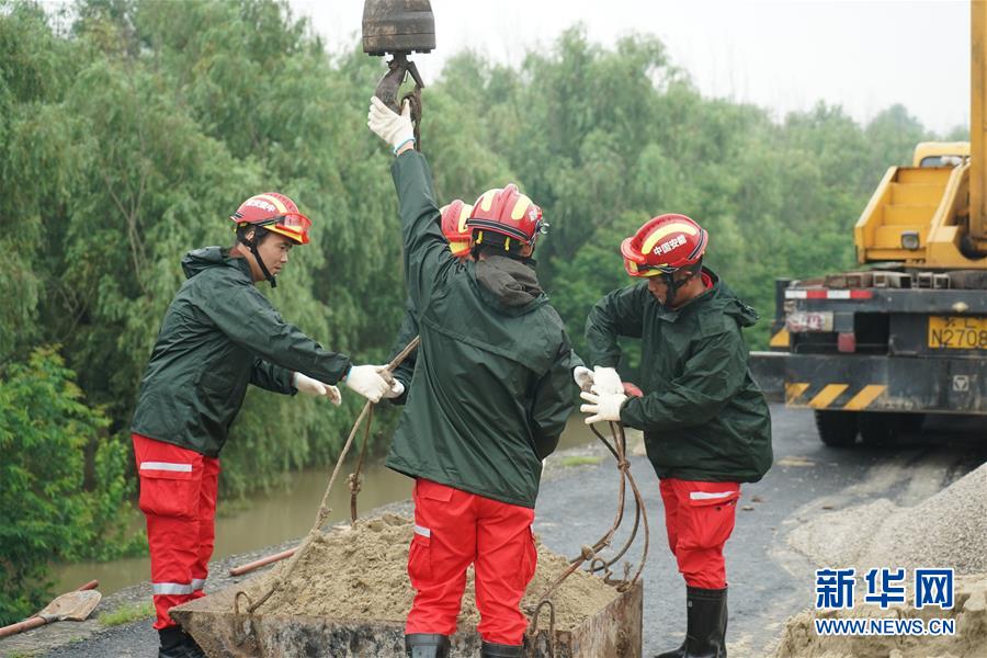 7月17日,在扬中市长江大堤新坝镇新宁村段,中国安能集团第二工程局常州分公司的抢险救援队员在吊装反滤料。 江苏扬中是长江第二大岛。入汛以来,受上游来水和天文大潮等因素的影响,长江扬中段持续高水位,扬中市广大干部群众及专业队伍严守江堤“生命线”,进行24小时巡堤查险,消除隐患,保护人民群众生命财产安全。 新华社记者 季春鹏 摄