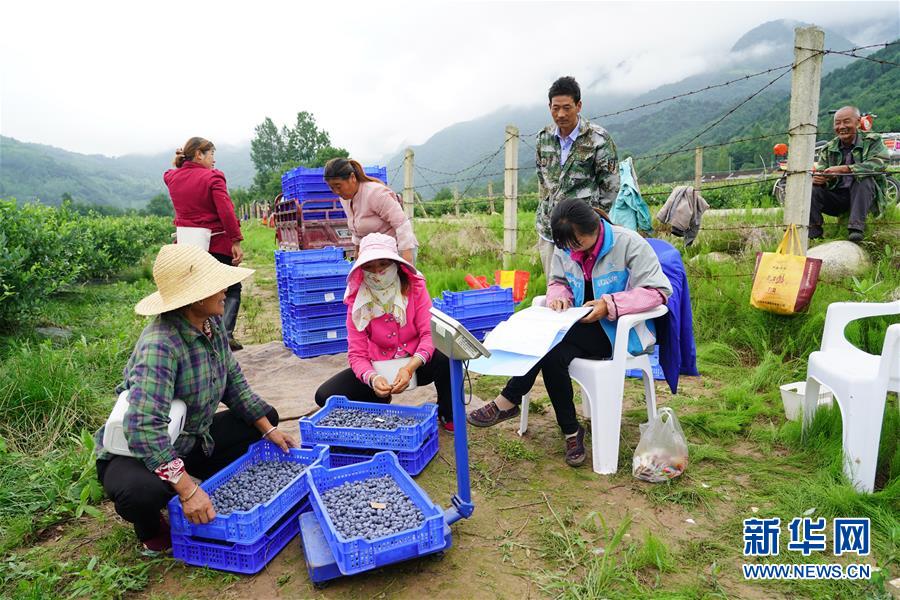 7月16日,太白县桃川镇杨下村村民在给采摘的蓝莓过称。 近年来,地处秦岭腹地的陕西太白县依托其海拔高、生态好等自然资源禀赋,在全县十余万亩耕地上合理发展产业,积极推动种植业向“小而美、小而精”的高山蔬菜、水果等方向发展,提高农产品附加值,促进群众增收。2019年,太白县高山蔬菜产量为45万吨,实现产值4.5亿元;莓类产业产量1412吨,产值1.05亿元。 新华社记者 邵瑞 摄