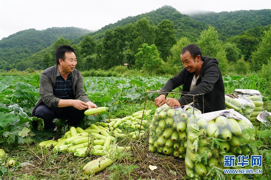 7月15日,在太白县咀头镇塘口村,农技人员与村民一起查看采收的西葫芦。 近年来,地处秦岭腹地的陕西太白县依托其海拔高、生态好等自然资源禀赋,在全县十余万亩耕地上合理发展产业,积极推动种植业向“小而美、小而精”的高山蔬菜、水果等方向发展,提高农产品附加值,促进群众增收。2019年,太白县高山蔬菜产量为45万吨,实现产值4.5亿元;莓类产业产量1412吨,产值1.05亿元。 新华社记者 邵瑞 摄