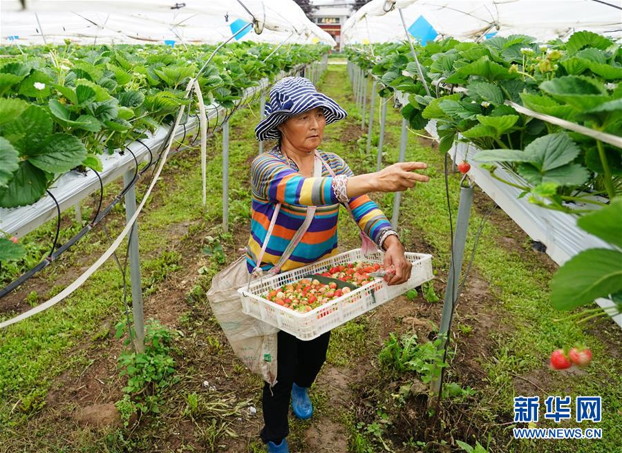 7月16日,在太白县咀头镇拐里村海升现代莓类产业示范园内,工人在采摘高架栽培草莓。 近年来,地处秦岭腹地的陕西太白县依托其海拔高、生态好等自然资源禀赋,在全县十余万亩耕地上合理发展产业,积极推动种植业向“小而美、小而精”的高山蔬菜、水果等方向发展,提高农产品附加值,促进群众增收。2019年,太白县高山蔬菜产量为45万吨,实现产值4.5亿元;莓类产业产量1412吨,产值1.05亿元。 新华社记者 邵瑞 摄