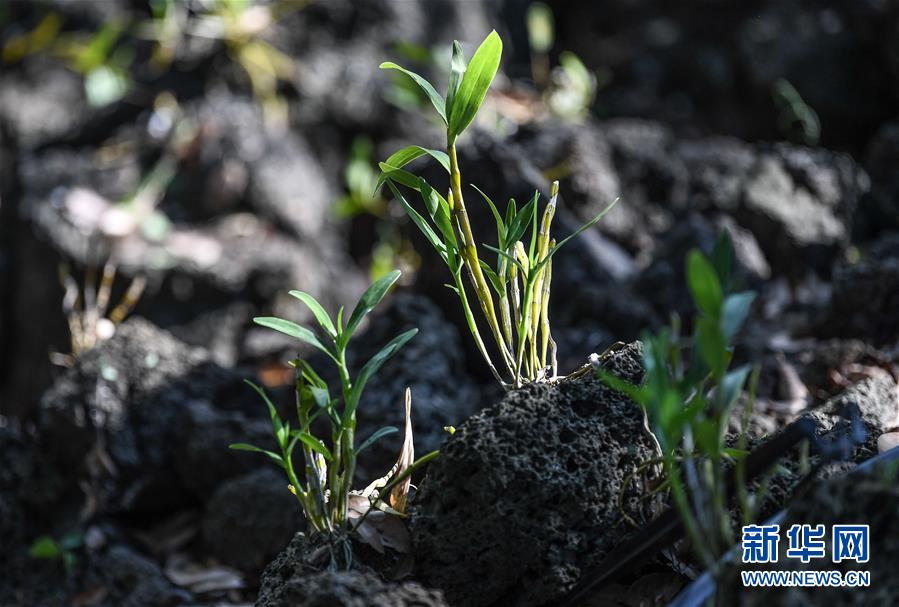 海口施茶村火山石斛园内生长在火山岩上的石斛(5月16日摄)。 新华社记者 蒲晓旭 摄