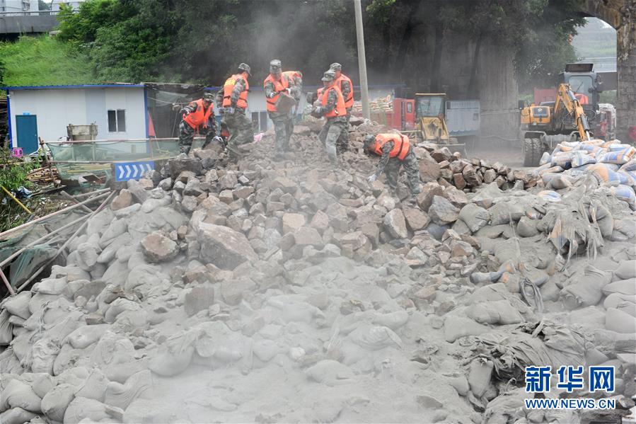 7月18日,救援人员对恩施市一处垮塌的清江河堤进行修复。 7月16日至17日,湖北恩施出现强降雨,城区大面积被淹。7月18日,主城区洪水退去,救援人员和当地群众积极开展城市清淤、河堤加固等工作。 新华社发