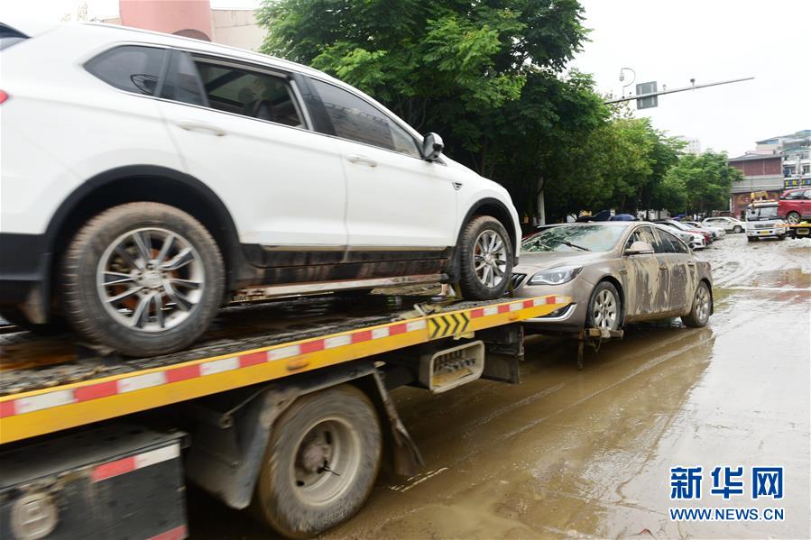 7月18日,在湖北省恩施市机场路,拖车拖走被洪水浸泡的车辆。 7月16日至17日,湖北恩施出现强降雨,城区大面积被淹。7月18日,主城区洪水退去,救援人员和当地群众积极开展城市清淤、河堤加固等工作。 新华社发