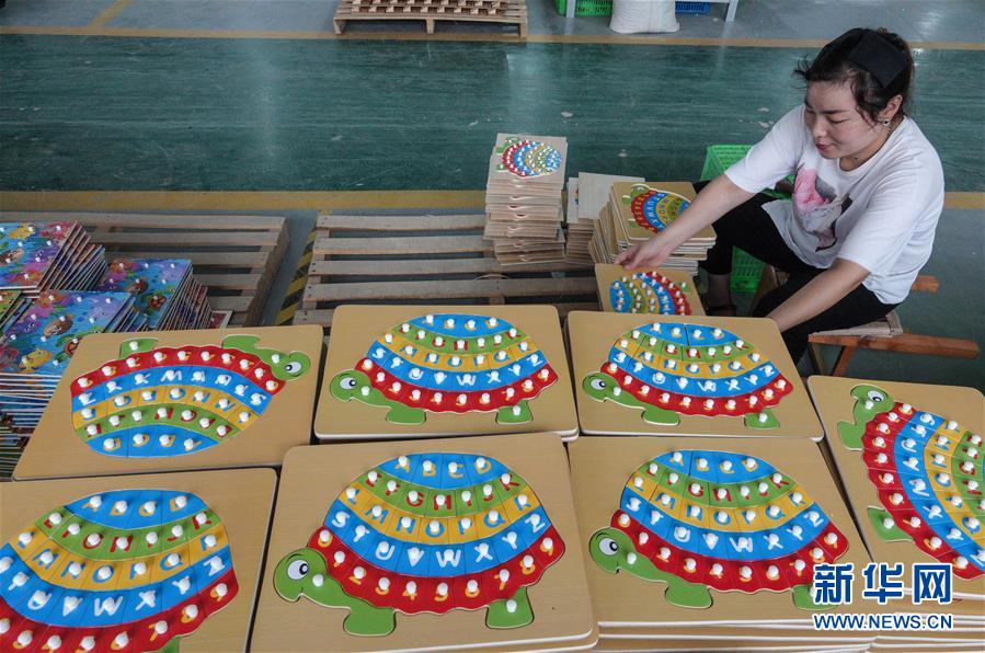 7月18日,一名工人在宿迁市楷悦工艺品有限公司里加工积木。该公司带动周围用工150多人。 新华社记者 杨磊 摄