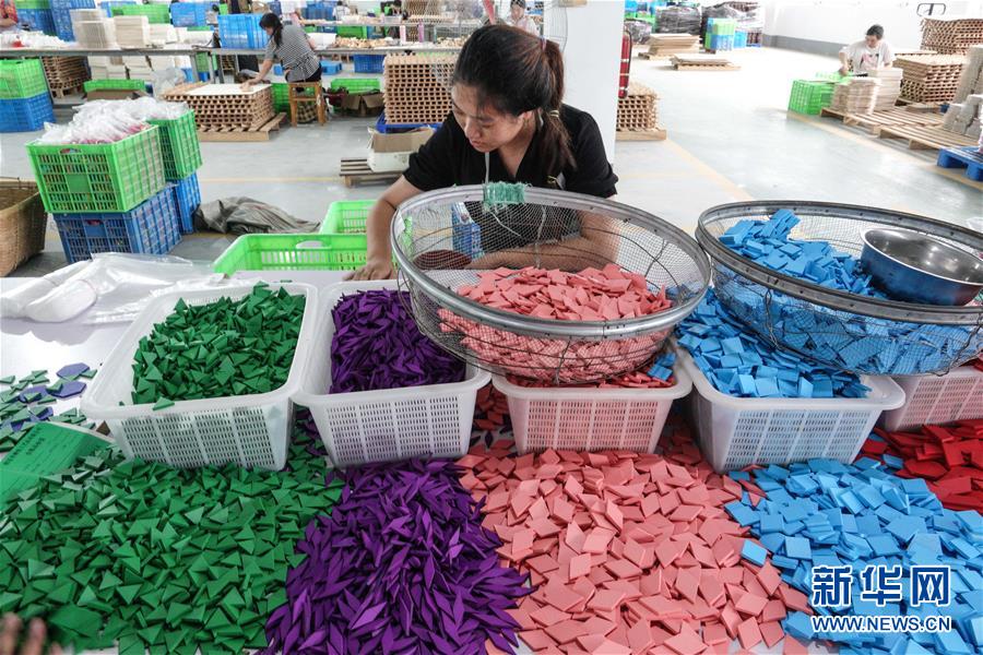 7月18日,一名工人在宿迁市楷悦工艺品有限公司里整理积木。该公司带动周围用工150多人。 新华社记者 杨磊 摄