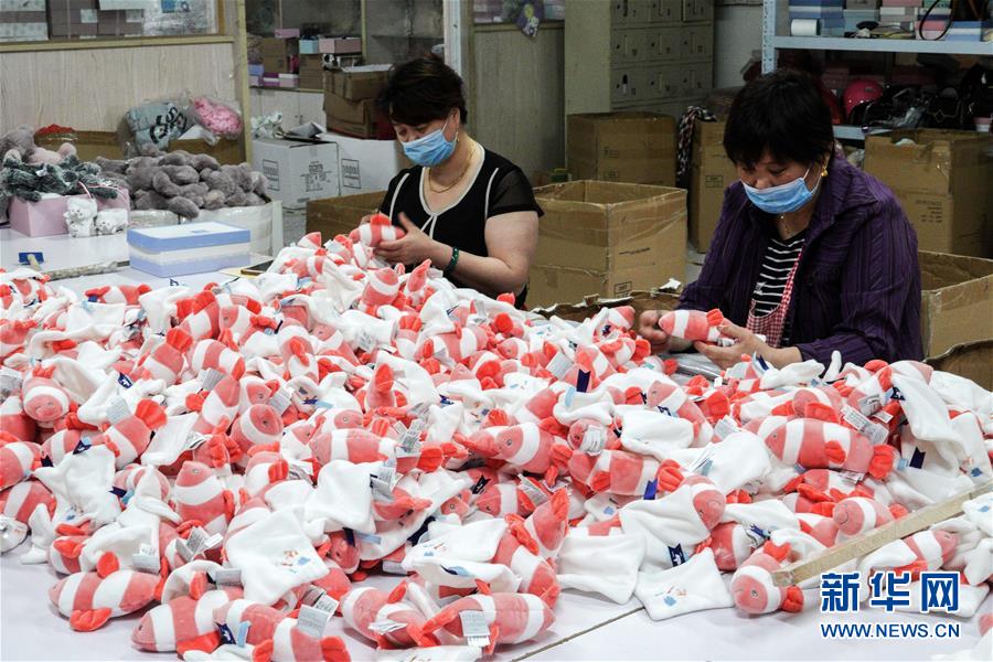 7月18日,几名工人在宿迁市康元工艺品有限公司里制作毛绒玩具。她们就近上班,每月收入2000多元。 新华社记者 杨磊 摄