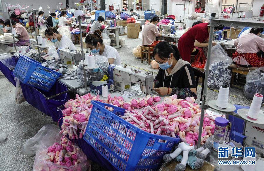 7月18日,工人们在宿迁市康元工艺品有限公司里制作毛绒玩具。她们就近上班,每月收入2000多元。 新华社记者 杨磊 摄