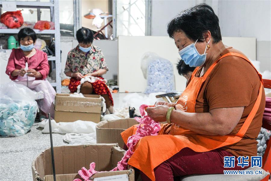 7月18日,65岁的农民赵翠萍(右)在宿迁市康元工艺品有限公司里制作毛绒玩具。她就近上班,每月收入2000多元。 新华社记者 杨磊 摄