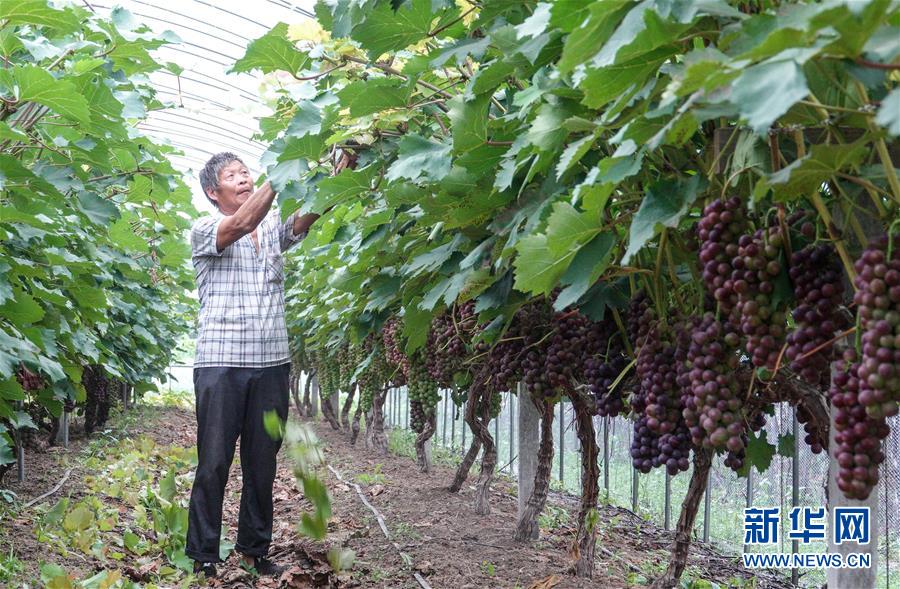 7月18日,陈集镇徐园村农民熊化良在葡萄园里整枝。他在这里务工每月有1000元左右的收入。 新华社记者 杨磊 摄