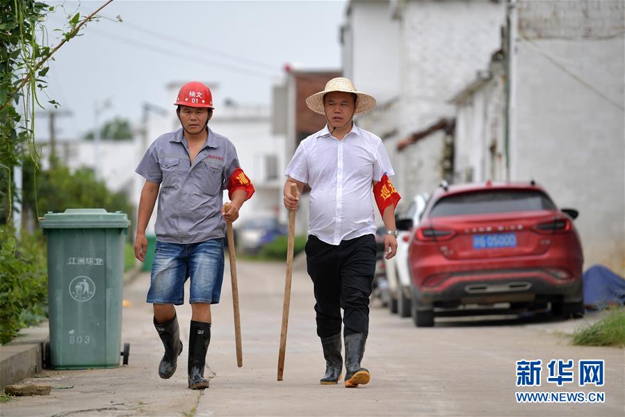 在江西省九江市柴桑区江新洲,返乡参与防汛人员杨世文(左)、杨世友兄弟在他们负责的坝段巡查(7月13日摄)。新华社记者 彭昭之 摄