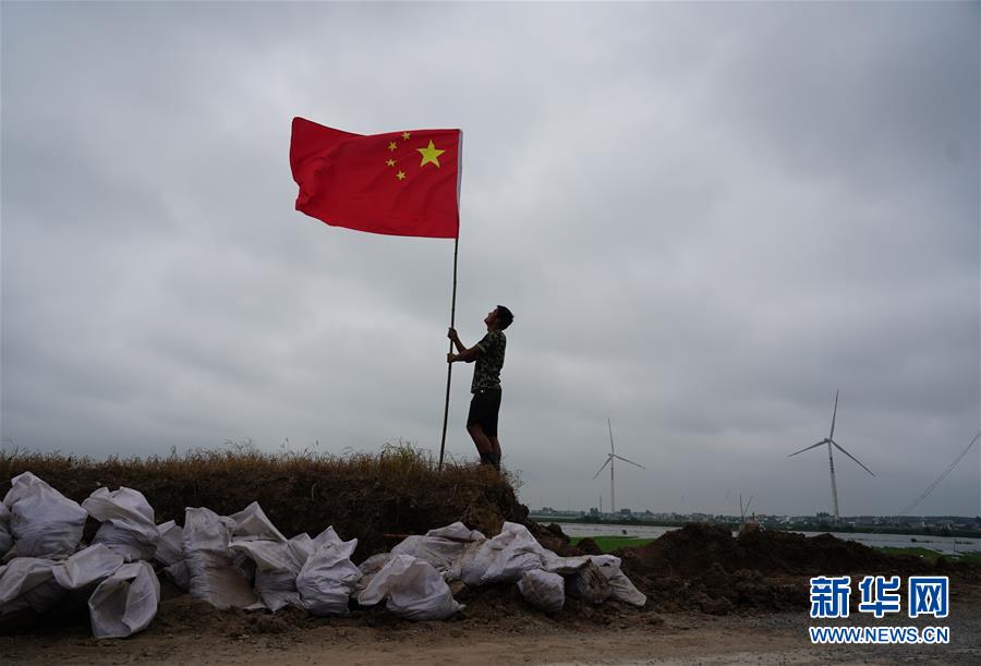 在江西省九江市柴桑区江新洲,张恒扶正防洪哨所前插的国旗(7月16日摄)。新华社记者 周密 摄