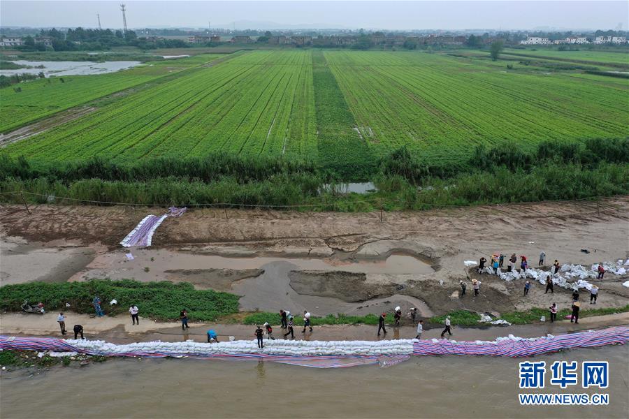 在江西省九江市柴桑区江新洲的防洪大堤上,防汛人员在搬运沙袋,加固堤坝,他们中大部分是主动返乡参与防汛人员(7月13日无人机照片)。新华社记者 彭昭之 摄