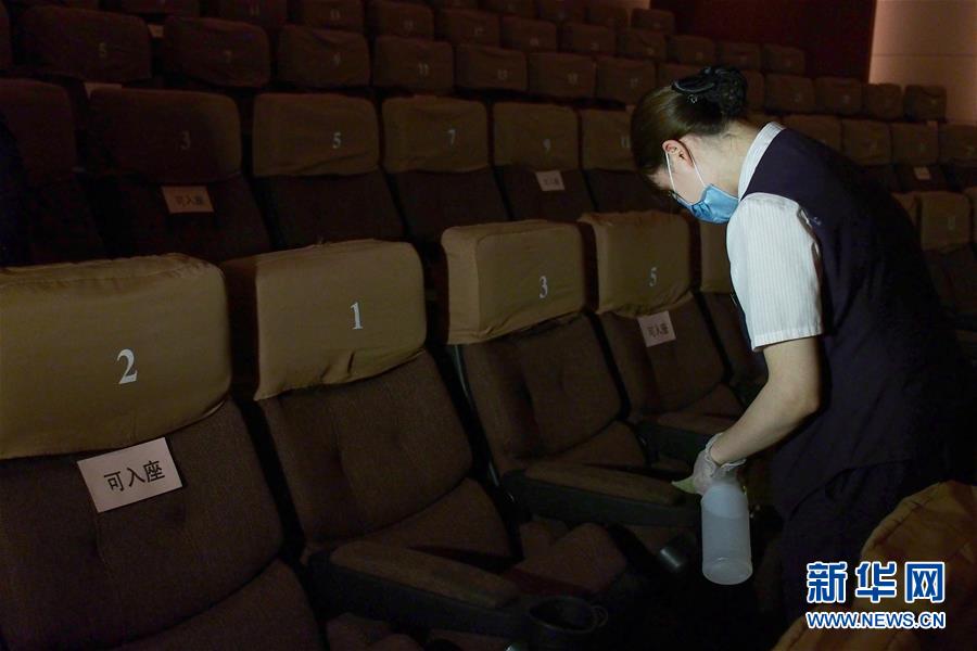 7月19日,上海影城员工在放映厅里为座位消毒。 当日,上海部分电影院为恢复开放营业进行最后阶段准备。国家电影局16日下发通知规定,低风险地区在电影院各项防控措施有效落实到位的前提下,可于7月20日有序恢复开放营业。 新华社记者 任珑 摄