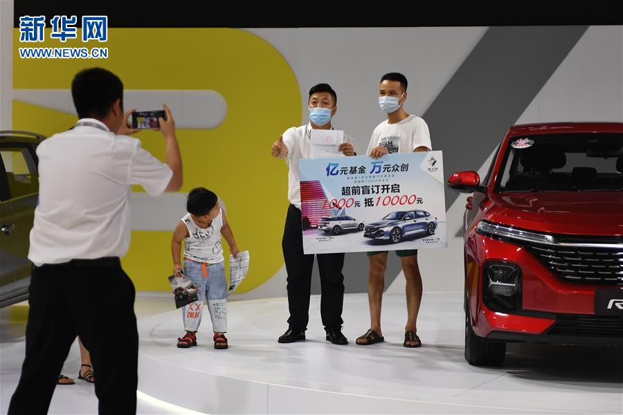 在第十七届中国(长春)国际汽车博览会宝骏展台,销售人员与订车消费者合影(7月13日摄)。 当日,为期10天的第十七届中国(长春)国际汽车博览会落下帷幕。据统计,展会期间累计销售车辆51852台,累计交易额103亿元。 新华社记者 张楠 摄
