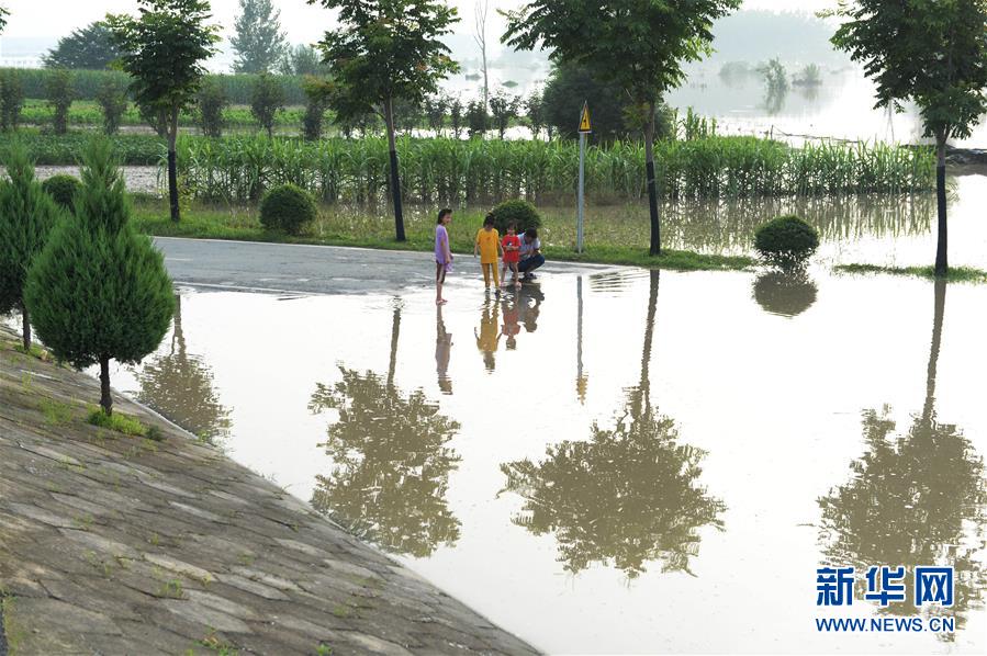 7月20日,在蒙洼蓄洪区内的郑台孜庄台,家长带着小朋友在水边玩耍。