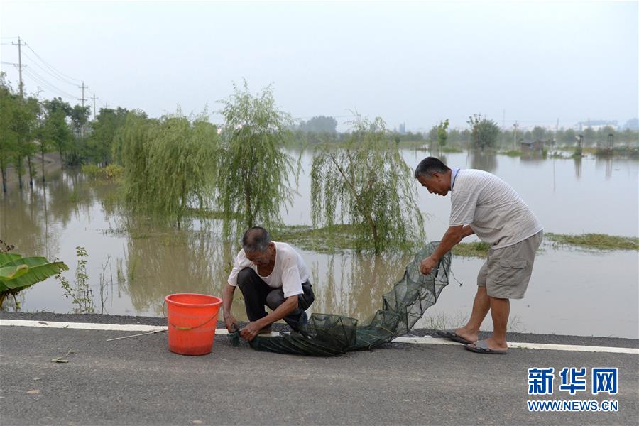 7月20日,在蒙洼蓄洪区内的郑台孜庄台,村民准备下网捕鱼。