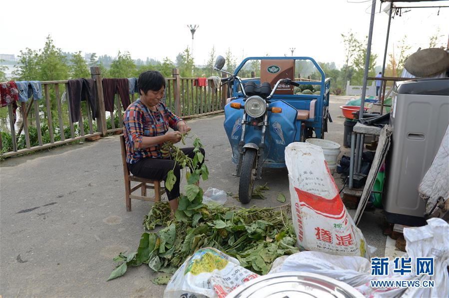 7月20日,在蒙洼蓄洪区内的郑台孜庄台,村民在摘毛豆。