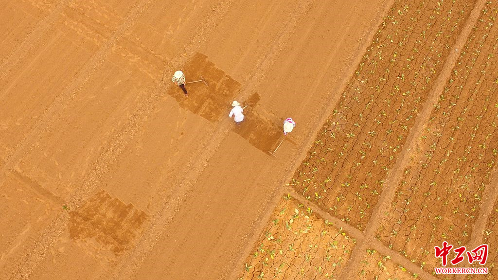 2020年7月21日,山东聊城,茌平区贾寨镇邢胡刘村的农民在田间平整土地为种植甘蓝做准备。(无人机照片)赵玉国/视觉中国