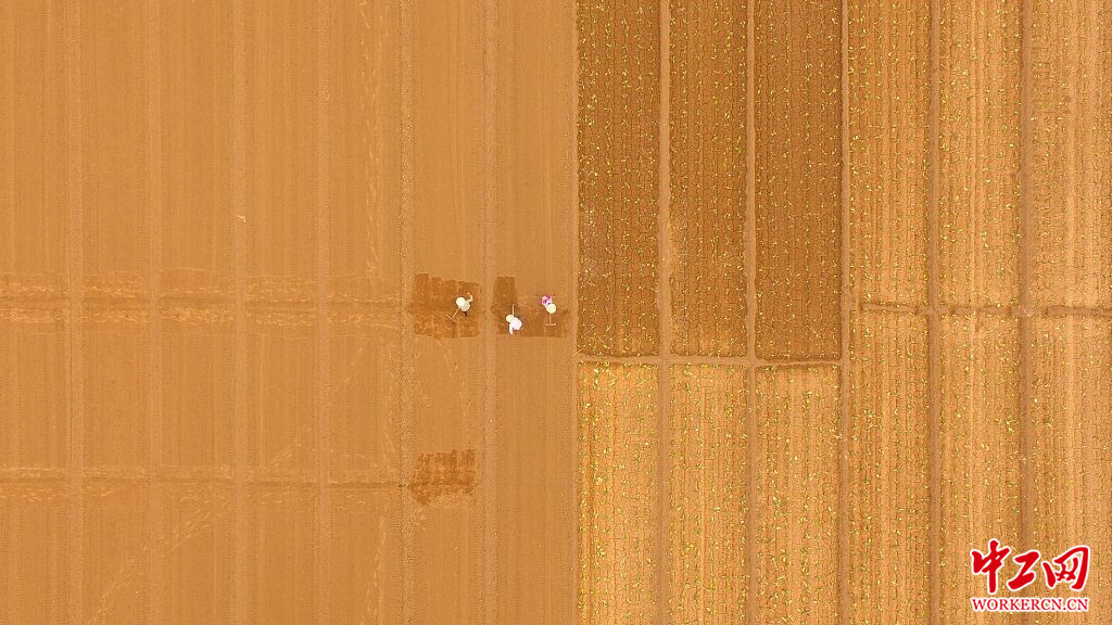 2020年7月21日,山东聊城,茌平区贾寨镇邢胡刘村的农民在田间平整土地为种植甘蓝做准备。(无人机照片)赵玉国/视觉中国