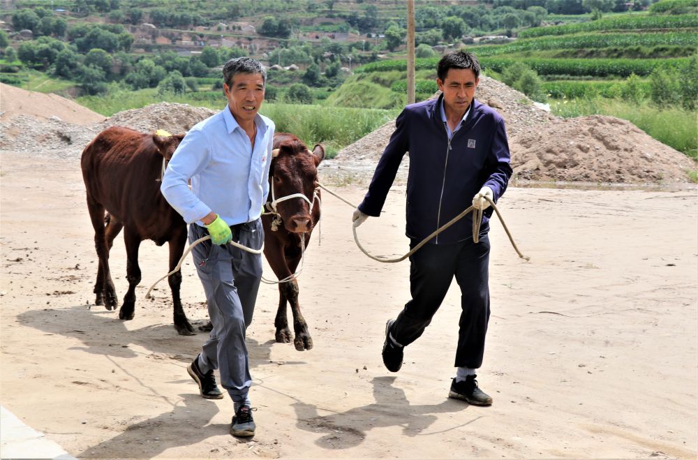 7月20日,甘肃省平凉市静宁县灵芝乡俊峰村的村民将在当地养牛专业合作社的“母牛超市”购买的牛牵回家。新华社发(王毅 摄)